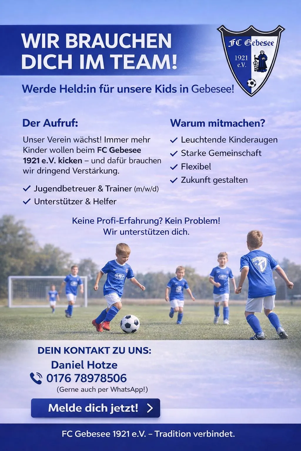 Wir suchen dringend Trainerinnen und Trainer sowie Unterstützer im Trainingsbereich für unsere Jüngsten. Dabei ist es ganz egal, ob Mann oder Frau, ob Elternteil, Jugendliche oder Seniorinnen und Senioren, alle sind gefragt und bei uns herzlich willkommen. Ihr müsst das nicht alleine machen, ihr findet bei uns immer Unterstützung. Wenn ihr uns ansprecht, wird euch geholfen und wir lassen euch nicht allein. Außerdem bieten wir Trainerlehrgänge und den Erwerb von Lizenzscheinen an. Kommt und seid ein Teil von uns.
