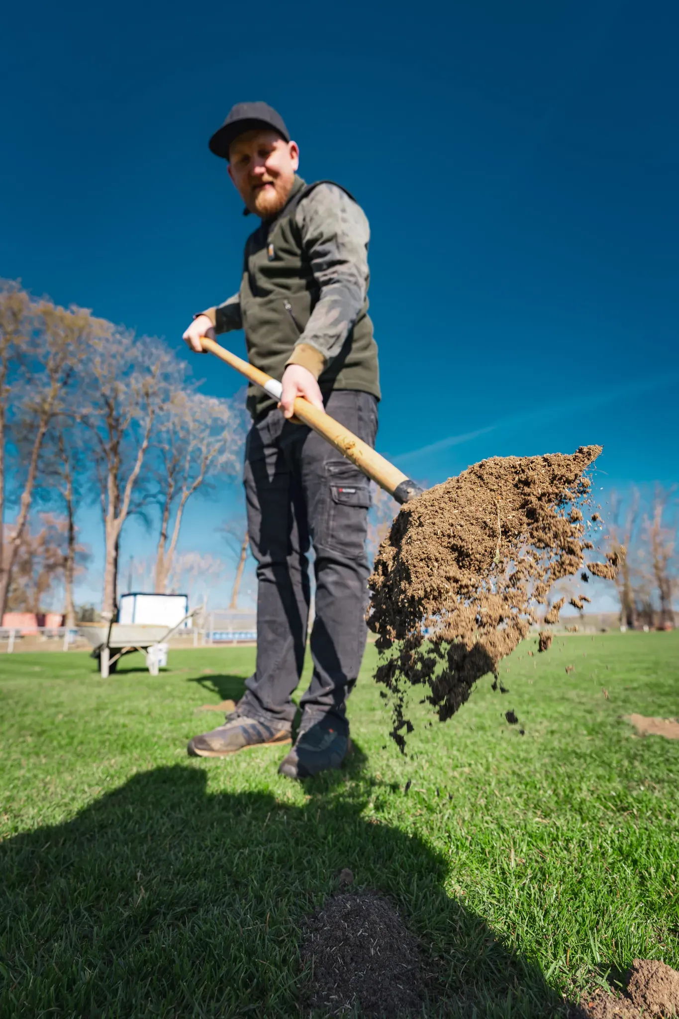 Im Fokus standen vor allem die Sportplätze. Diese wurden instandgesetzt, Unebenheiten und Löcher geschlossen sowie vertikutiert und gedüngt, um optimale Bedingungen für den Spielbetrieb zu schaffen. Darüber hinaus wurde der Außenbereich umfassend gepflegt und die Entwässerungsanlage überprüft.