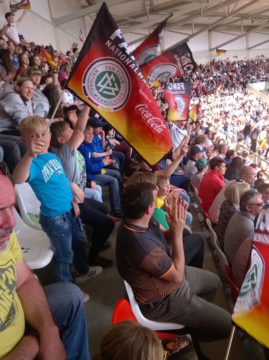 Am gestrigen Sonntag waren wir in Erfurt beim Länderspiel unserer Frauen Nationalmannschaft gegen Kanada . Bei bestem Wetter ging es mit Zug und Straßenbahn zum Stadion. Für die meisten war es der erste Stadion Besuch und sie kamen aus dem staunen gar nicht mehr raus . So viele Menschen auf einem Haufen hatten die wenigsten schon mal live erlebt! Das Spiel war zwar nicht das beste , das störte aber niemanden . Die Stimmung bei uns war trotzdem Super und am Ende sahen wir ja auch noch einen Sieg .